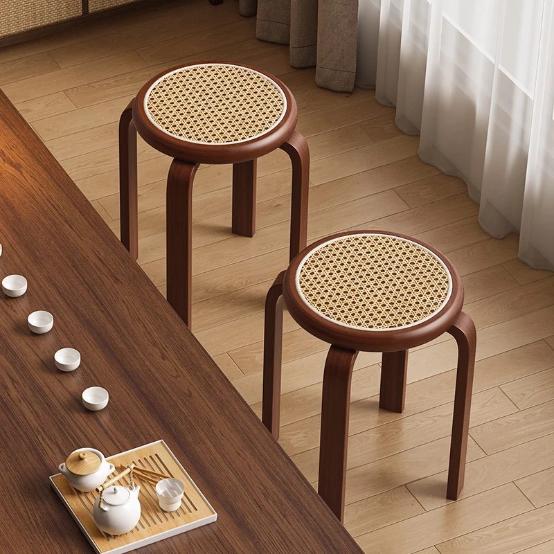 天然木製のラタン編みサークルスツール - 家庭用に最適なヴィンテージ風ダイニングチェア。リビングでの長時間のくつろぎに最適!ティーテーブル用の快適なベンチ、ダイニングルームのサブスツールとしても使えます。